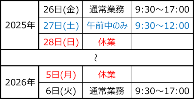 2025/12/18 事務局の年末年始の休業について 事務局は12月27日(土)午後から2026年1月5日(月)まで、お休みとさせていただきます。1月6日(火)より通常通りの業務となりますのでよろしくお願いいたします。