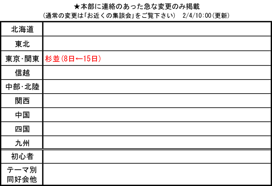 2026/02/04 【速報版】2月度 集談会・懇談会 休会変更まとめ <代表幹事様> 休会・変更のご連絡を事務局に頂く際は、集談会・懇談会名と共に休会となる日付と曜日も合わせてご連絡お願いいたします。