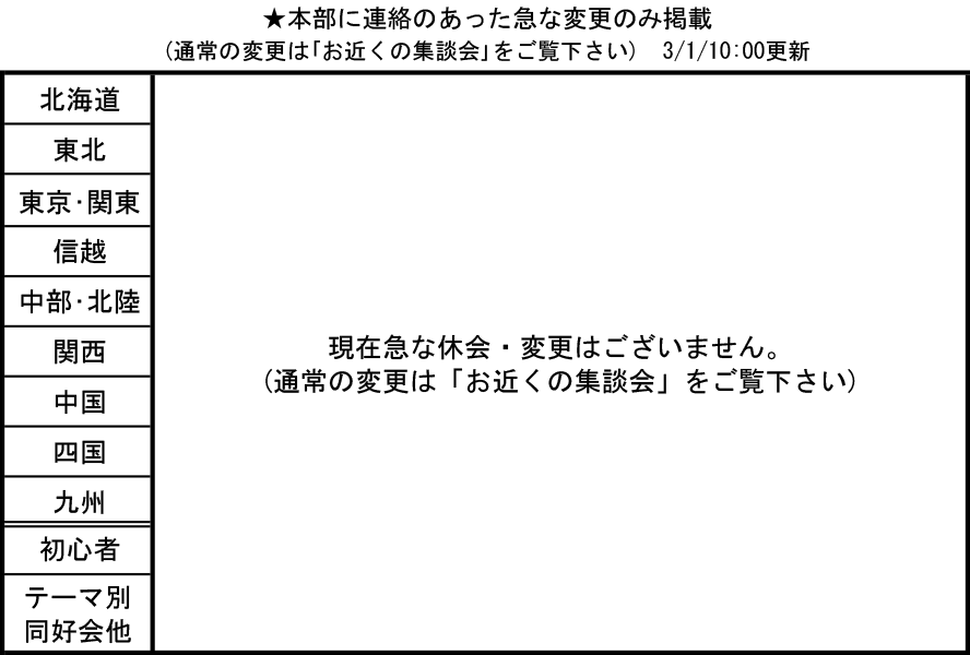 2026/03/01 【速報版】3月度 集談会・懇談会 休会変更まとめ <代表幹事様> 休会・変更のご連絡を事務局に頂く際は、集談会・懇談会名と共に休会となる日付と曜日も合わせてご連絡お願いいたします。